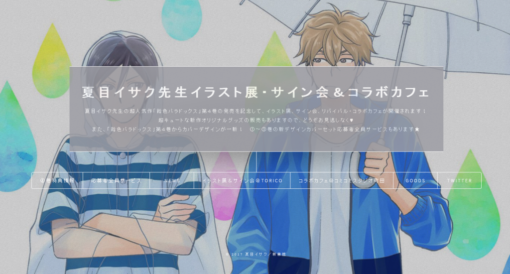 夏目イサク先生の超人気作「飴色パラドックス」第4巻の発売を記念して、イラスト展、サイン会、リバイバル・コラボカフェが開催されます! 超キュートな新作オリジナルグッズの販売もありますので、どうぞお見逃しなく♥