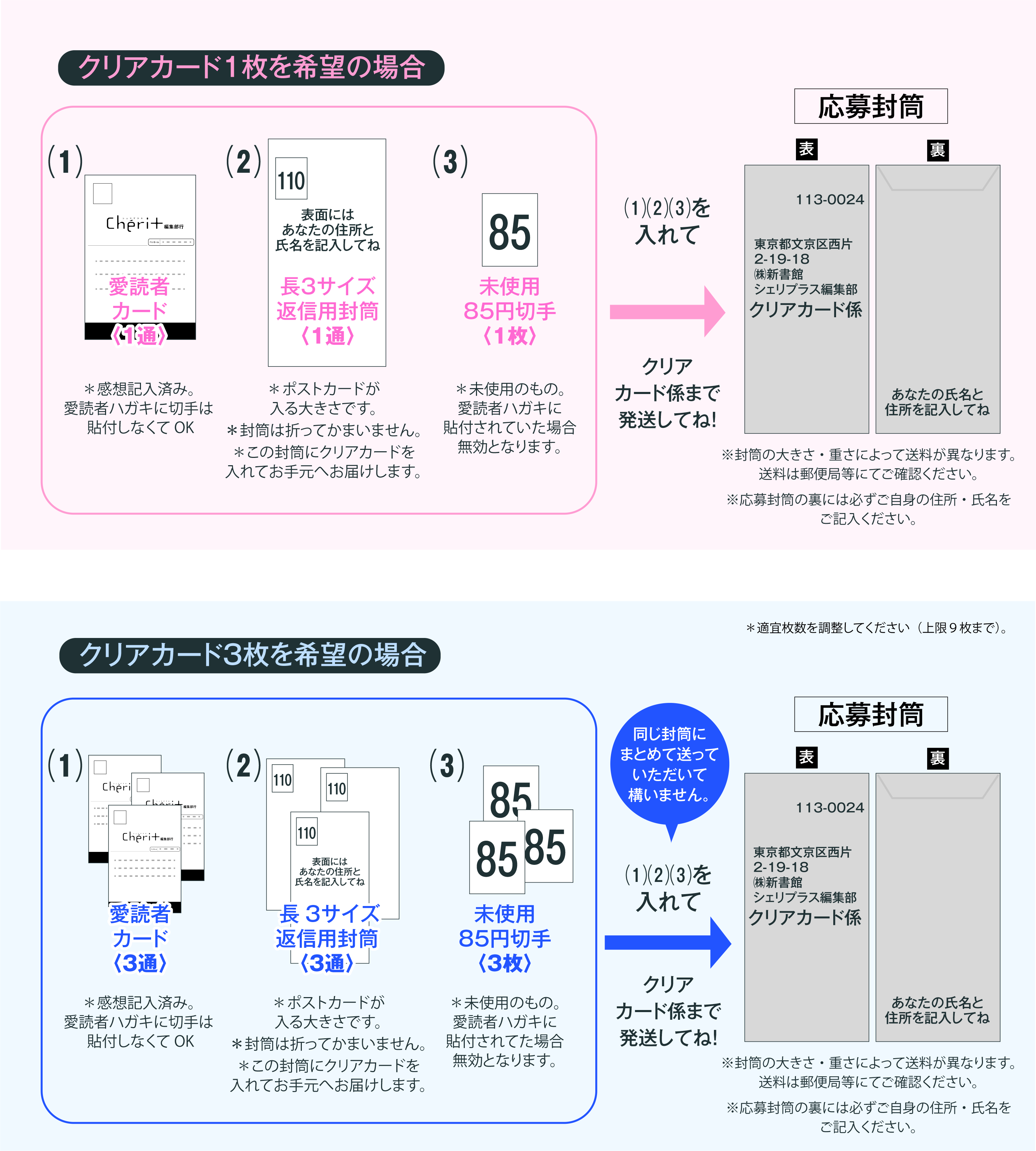 例)「愛読者カード3通+110円切手貼付済み返信用封筒3通+85円切手3枚(または255円分の切手)」を封書に入れてご応募ください。