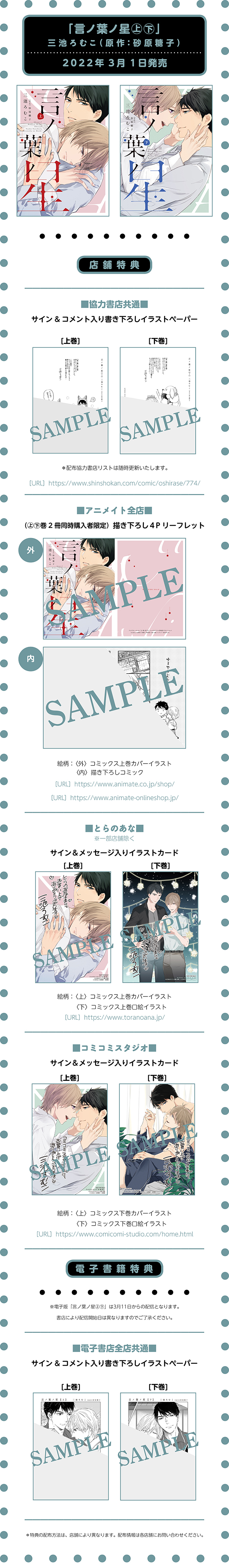 三池ろむこ先生(原作:砂原糖子先生)「言ノ葉ノ星㊤㊦」購入特典情報!