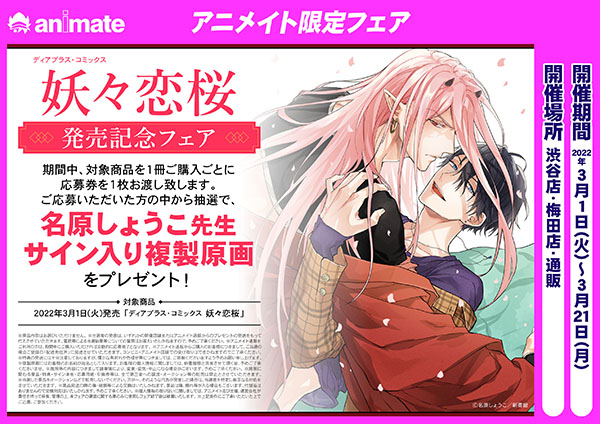 期間中、アニメイト渋谷・アニメイト梅田・アニメイト通販にて「妖々恋桜」を1冊ご購入ごとに応募券を1枚お渡し致します。