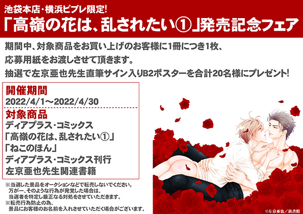 4月1日発売、左京亜也先生のディアプラス・コミックス『高嶺の花は、乱されたい①』の刊行を記念して下記の書店にて発売記念フェアを行います!
