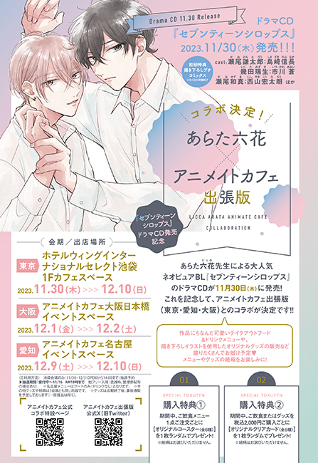 あらた六花先生による大人気ネオピュアBL『セブンティーンシロップス』のドラマCDが11月30日(木)に発売! これを記念して、アニメイトカフェ出張版(東京・愛知・大阪)とのコラボが決定です!!