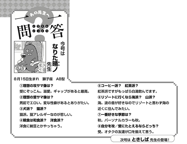 ディアプラス11月号の「ディアフレンズ」内「あの先生へ一問一答」コーナーにおきまして、なりた晴ノ先生の回答の内容が前号掲載テキストのままになっておりました。