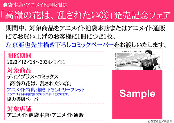 期間中、アニメイト池袋本店、アニメイト通販(アニメイトオンライン)にて『高嶺の花は、乱されたい③』をお買い上げのお客様に、限定描き下ろしコミック・ペーパーをプレゼントいたします。