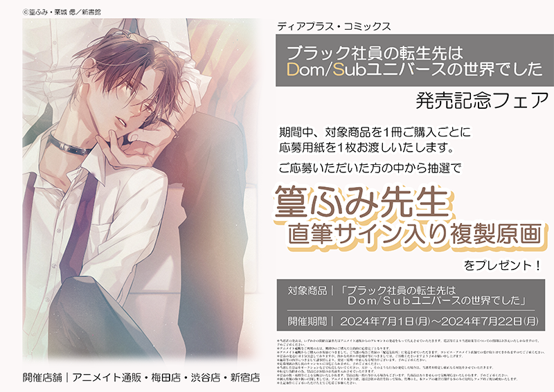 期間中、アニメイト通販・アニメイト梅田・アニメイト渋谷・アニメイト新宿にて『ブラック社員の転生先はDom/Subユニバースの世界でした』を1冊ご購入ごとに応募券を1枚お渡しいたします。ご応募いただいた方の中から抽選で「篁ふみ先生サイン入り複製原画」をおひとつプレゼント!