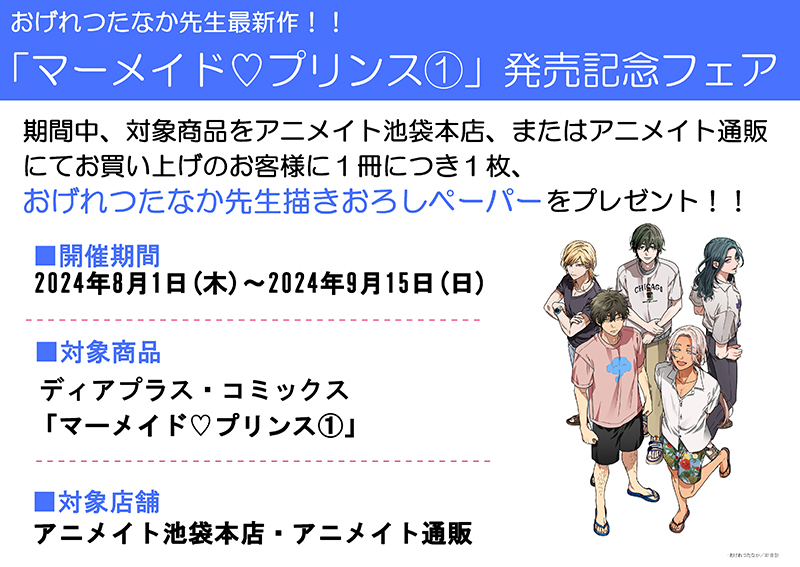 おげれつたなか先生がwebで公開中の漫画をコミックス化!! ディアプラス・コミックス『マーメイド♡プリンス①』(8月1日発売)の刊行を記念して、下記の書店にて限定描き下ろしペーパーがもらえるフェアを行います!