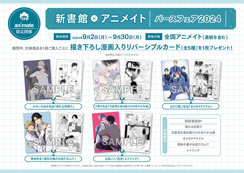 全国のアニメイト(通販含む)にて、期間中、対象コミックスを1冊ご購入ごとに「描き下ろしコミック入りリバーシブルカード〈全5種〉」を1枚プレゼントするフェアを開催します♥