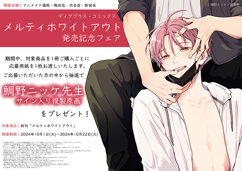 10月1日発売、鯛野ニッケ先生の初ディアプラス・コミックス『メルティホワイトアウト』の刊行を記念して、下記の書店にて発売記念フェアを行います!