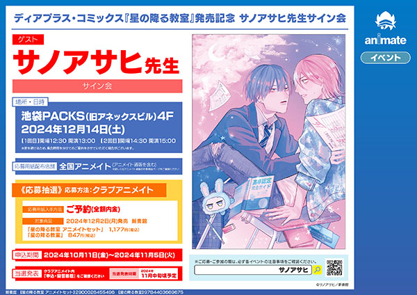 12月2日発売、サノアサヒ先生のディアプラス・コミックス「星の降る教室」の発売を記念して、先生初・抽選制のリアルサイン会が開催決定! 直接先生に会えるチャンスをお見逃しなく♥︎