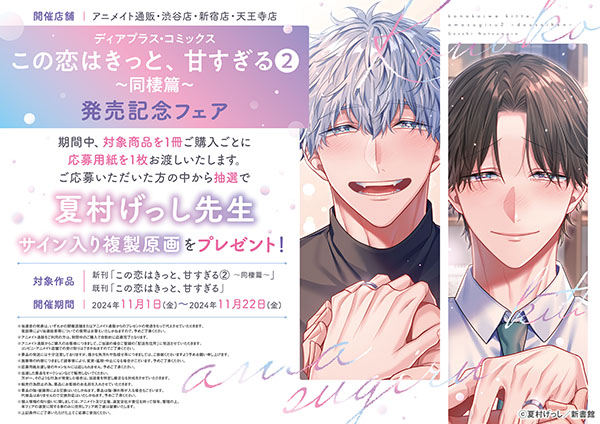 期間中、アニメイト通販・アニメイト渋谷・アニメイト新宿・アニメイト天王寺にて新刊『この恋はきっと、甘すぎる②〜同棲篇〜』または既刊『この恋はきっと、甘すぎる』を1冊ご購入ごとに応募券を1枚お渡しいたします。ご応募いただいた方の中から抽選で「夏村げっし先生サイン入り複製原画」をおひとつプレゼント!