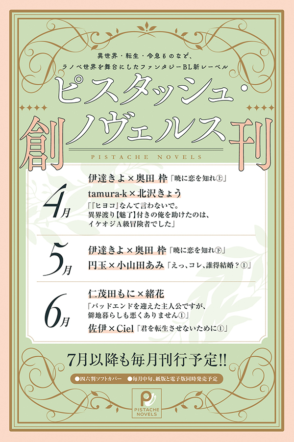 2025年4月中旬、新書館より、異世界・転生・令息ものなど、ラノベ世界を舞台にしたファンタジーBL新レーベル、ピスタッシュ・ノヴェルスを創刊します。