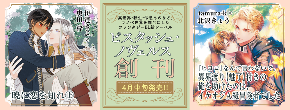 異世界・転生・令息ものなど、ラノベ世界を舞台にしたファンタジーBL新レーベル、ピスタッシュ・ノヴェルスが創刊!!