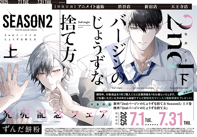 7月1日発売、ずんだ餅粉先生のディアプラス・コミックス『2ndバージンのじょうずな捨て方 Season2㊤㊦』の刊行を記念して、下記の書店にて発売記念フェアを行います!
