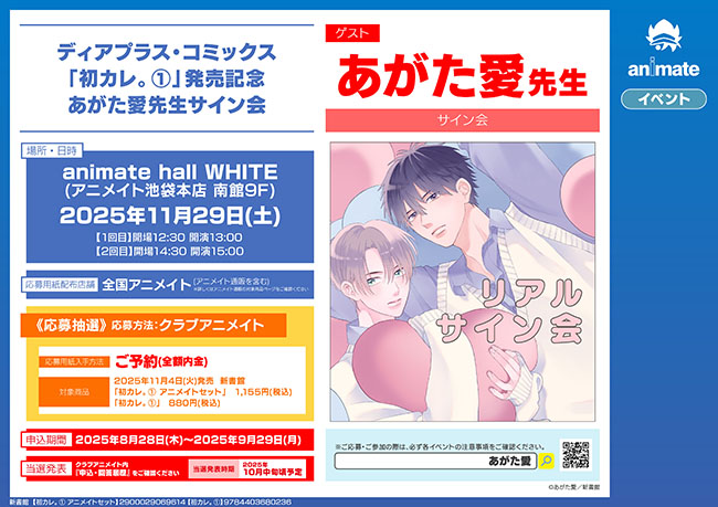 11月4日発売、あがた愛先生の初ディアプラス・コミックス「初カレ。①」の発売を記念して、抽選制のリアルサイン会が開催決定! 直接先生に会えるチャンスをお見逃しなく♥︎