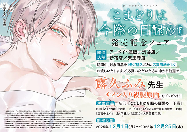 12月1日発売、露久ふみ先生のディアプラス・コミックス『こまどりは今際の目醒め㊦』の刊行を記念して、発売記念フェアを行います!