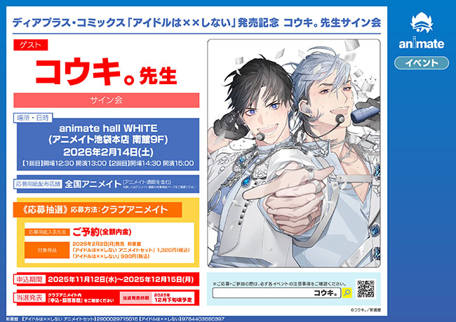 2月2日発売、コウキ。先生のディアプラス・コミックス「アイドルは××しない」の刊行を記念して、抽選制のリアルサイン会が開催決定!