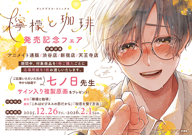 12月26日発売、七ノ日先生のディアプラス・コミックス「檸檬と珈琲」の刊行を記念して、下記の書店にて発売記念フェアを行います!