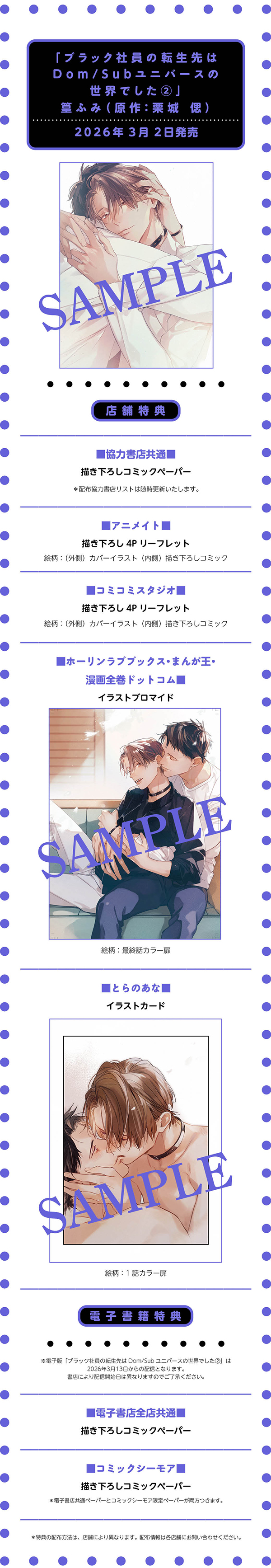 篁ふみ先生(原作:栗城 偲先生)「ブラック社員の転生先はDom/Subユニバースの世界でした②」購入特典情報!