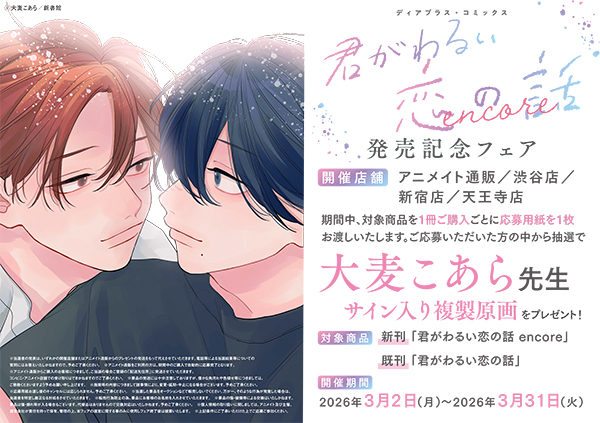 3月2日発売、大麦こあら先生のディアプラス・コミックス『君がわるい恋の話 encore』の刊行を記念して、下記の書店にて発売記念フェアを行います!