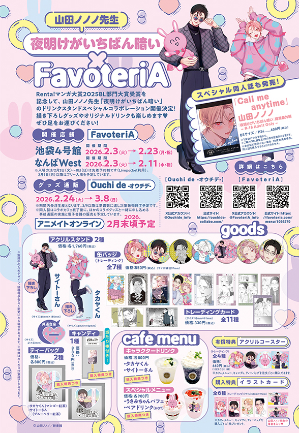 Renta!マンガ大賞2025BL部門大賞受賞を記念して、山田ノノノ先生「夜明けがいちばん暗い」のドリンクスタンドスペシャルコラボレーションが開催決定! 描き下ろしグッズやオリジナルドリンクも楽しめます❤︎ ぜひ足をお運びください!