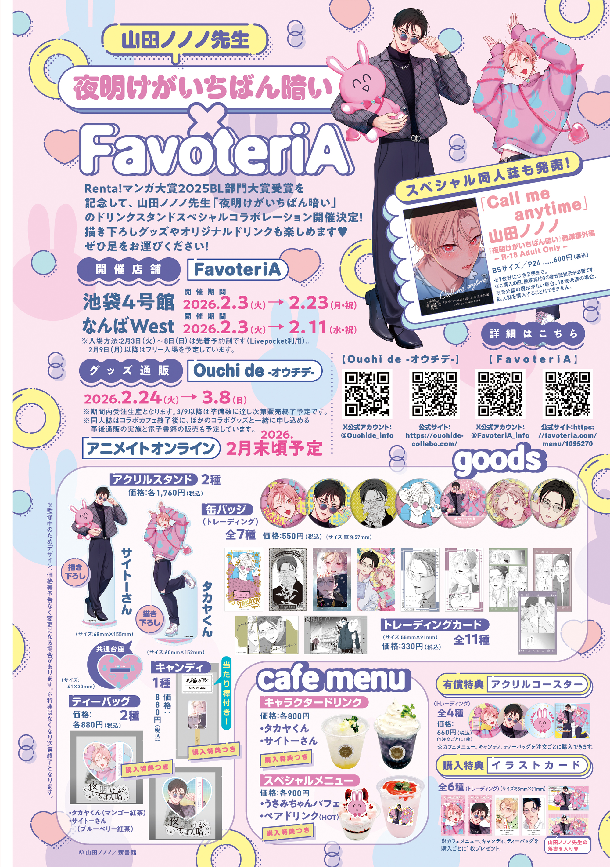 Renta!マンガ大賞2025BL部門大賞受賞を記念して、山田ノノノ先生「夜明けがいちばん暗い」のドリンクスタンドスペシャルコラボレーションが開催決定! 描き下ろしグッズやオリジナルドリンクも楽しめます❤︎ ぜひ足をお運びください!