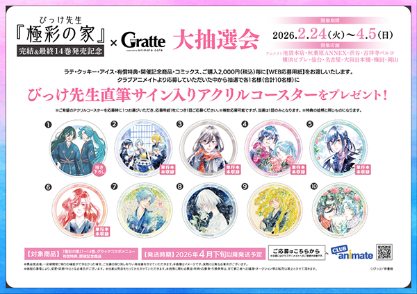 2月26日頃発売、びっけ先生のウィングス・コミックス「極彩の家」最終14巻の刊行&完結を記念して、アニメイトにてGratteコラボが開催!!