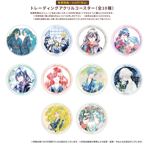 「極彩の家」描き下ろしや単行本未収録イラストなどを使用したグラフィックラテ&クッキー、有償特典コースター、一部店舗ではグラフィックアイスを販売。さらに開催記念商品として、描き下ろしアクリルスタンドも販売されるので、どうぞお楽しみに!!