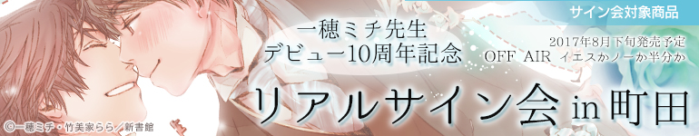 一穂ミチ先生のデビュー10周年を記念して、8月下旬発売の単行本「OFF AIR」(イラスト・竹美家らら先生)をコミコミスタジオ様にてご購入いただいた方対象にサイン会が開催されます。同時にコミコミスタジオ町田店で複製原画展・コラボカフェ(8月17日~9月6日)・グッズ発売も決定。一穂先生の10周年をぜひ一緒にお祝いしてください♡