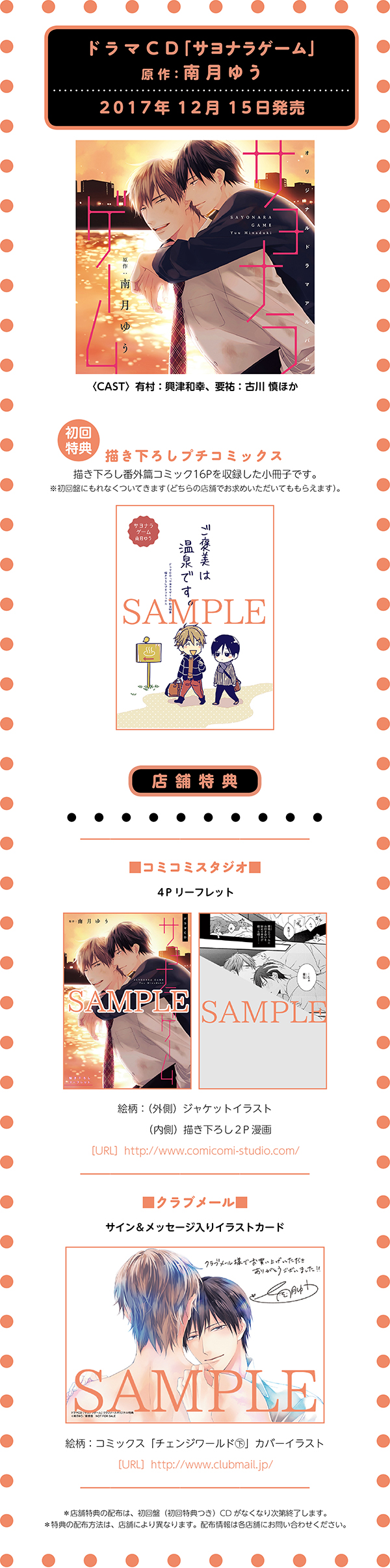 南月ゆう先生原作ドラマCD「サヨナラゲーム」購入特典情報!