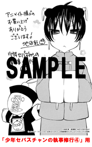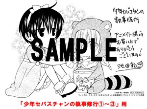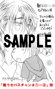 2)アニメイト様で「戦う! セバスチャン♯①~③」、「少年セバスチャンの執事修行①~③」をお買い上げいただいた方に、既刊用描き下ろしメッセージシートをプレゼント!