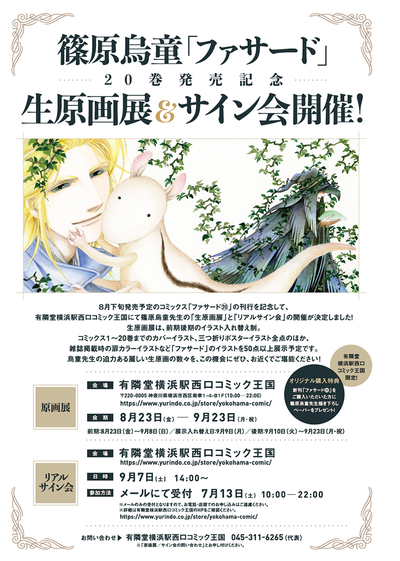 お知らせ 2019年6月28日 篠原烏童先生「ファサード」20巻発売記念 生原画展&サイン会開催! サイン会のお申し込み方法など、詳しくはこちらのサイトをご覧ください。 https://www.yurindo.co.jp/yokohama-comic/7666 新書館
