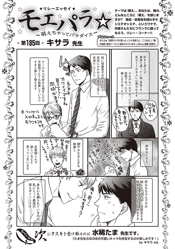 ディアプラス2月号(1月14日発売)の「リレーエッセイ モエパラ」におきまして、描き文字が消えた状態で原稿が掲載されておりました。正しくは以下となります。
