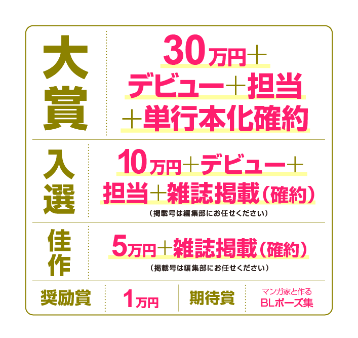 また、「新書館BLマンガ大賞」に投稿中の作品は、その結果が出るまで他社への投稿を禁じます。