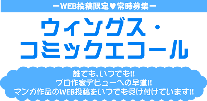 また、「ウィングス・コミックエコール」に投稿中の作品は、その結果が出るまで他社への投稿を禁じます。