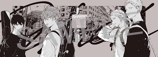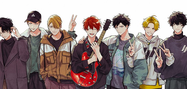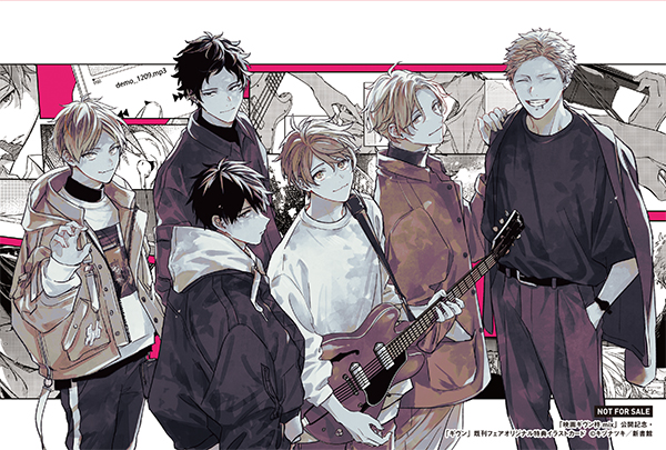 美しい夕景をバックに、『ギヴン』シリーズの主人公・佐藤真冬を中心に、バンド「ギヴン」と「syh〈シー〉」のメンバーが揃う一枚が完成しました!