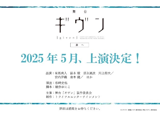 ■2021年11月に東京・京都で上演した舞台『ギヴン』の続編として、舞台『ギヴン 海へ』の上演が決定しました。2025年5月に上演予定です。こちらも続報をお楽しみに!■