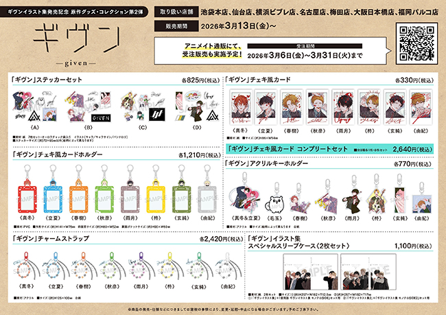 ギヴンイラスト集第2弾の刊行を記念して、描き下ろしのカバーイラストを使用した新グッズをはじめ、原作イラストを使用した魅力的なグッズ満載で、アニメイト7店舗+通販にて販売決定!
