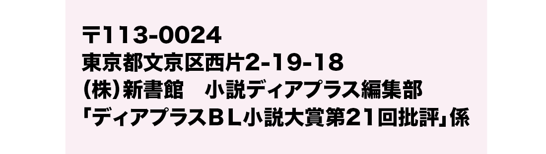 ◎第21回ディアプラスBL小説大賞・第四次選考通過以上の希望者の方に簡単な個別評をお送りします。ご希望の方は2024年7月19日(当日必着)までに84円切手貼付済みの返信用封筒(定型内サイズのもの)を以下の宛先までお送りください。