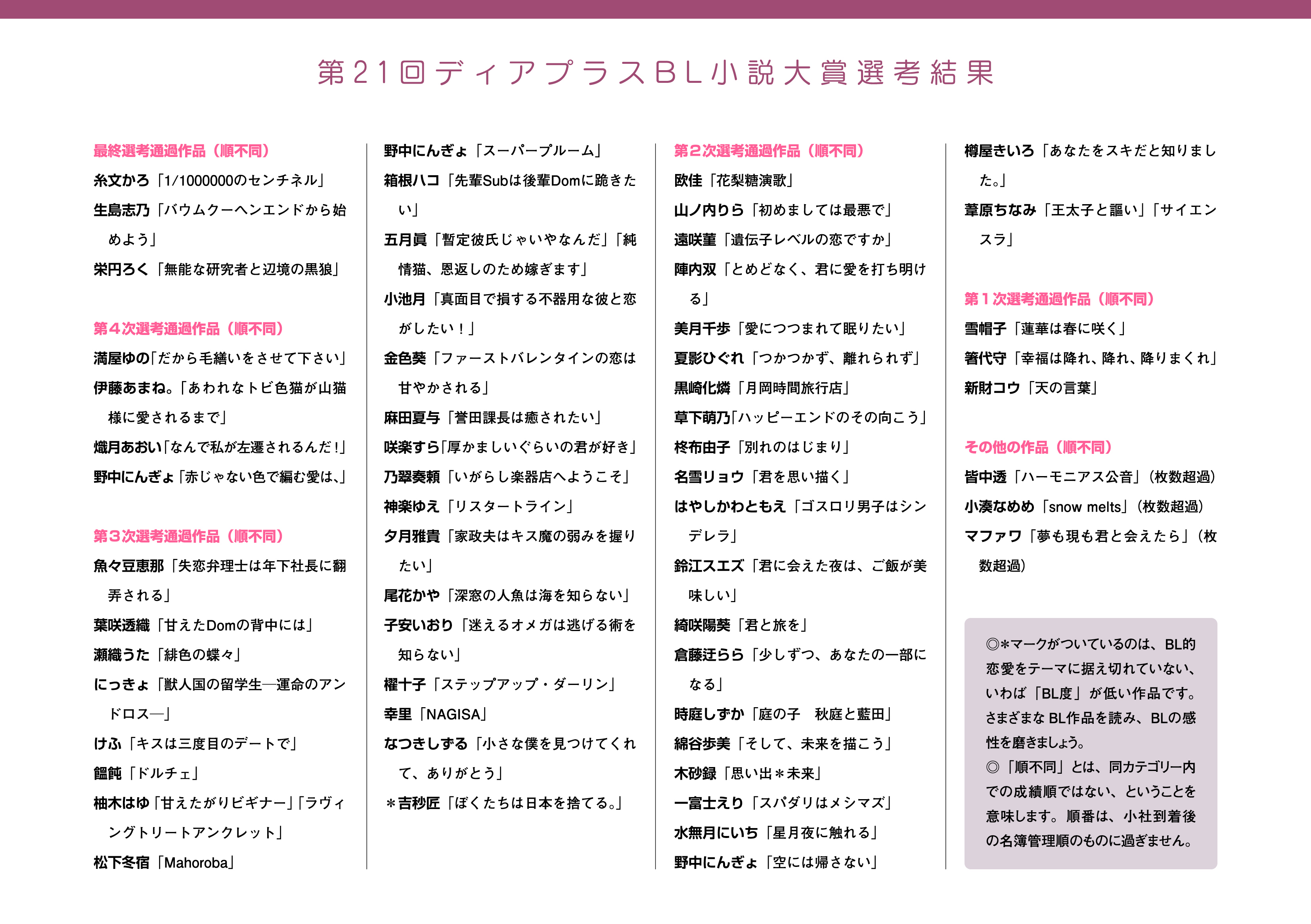 「ディアプラス・チャレンジスクール〈小説部門〉」、そして「ディアプラスBL小説大賞」と、編集部では二十年以上にわたって作品を募集してきました。今までの形式での募集は最後になります。二十年余の間、世の中は変化し、BL小説界にもさまざまな変化が訪れました。プロの小説家を目指す皆さんも、どうか変化していってください。編集部も常に読者さんの方を向いて良い変化を続けたいと思っております。