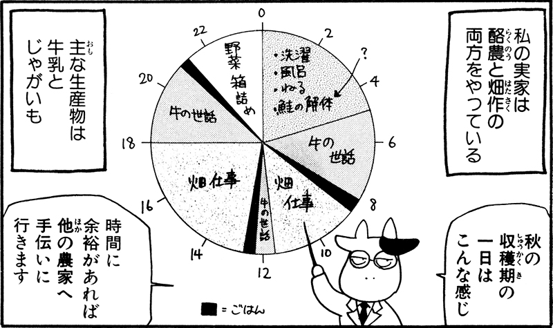 「百姓貴族」にかかわるネタでいえば、荒川さんの家から野菜が届いたり、ご親戚の方から美味しい物が届くので、仕事場では料理に困りませんでした。たとえば仕事場にご親戚から牡蠣の一斗缶が送られて来たり、またご実家の方からも野菜が届くので、それを使って料理をしていたんですが、元の味がいいので、無理して凝った味付けにしなくていいんです。健康になるなって思いながら料理していましたし、実際にアシスタント仲間も、ここに来ると太るって言ってまして(笑)。それに何が面白いって、全国各地からアシスタントの方たちが来ているので、違う食文化を味わう事が出来るんですよ。正月に集まった時に、関西担当の子が味噌仕立てのお雑煮を作ってくれた、とか。それも楽しかったです。