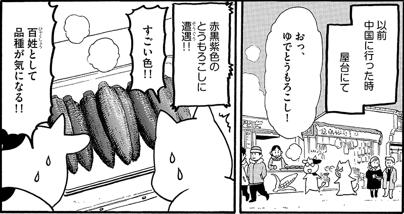 でも今から思うと、トウモロコシが甘くないのって、当時の中国では意外と標準だったのかもしれなくて。私が雲南省をひとりで旅していた時に、藍染め工房のお姉さんが、「私のおやつ半分分けてあげる」ってトウモロコシを分けてくれたんですよ。飼料用のトウモロコシで全然甘くなかったんですけど、お姉さんは普通に食べていたので、甘くなくてもお金のあまりかからないおやつ、くらいの感覚だったかも。西太后も田舎に逃げた時にトウモロコシの粉を練って蒸したものを出されて食べたとか言われていたりするんで、甘くないトウモロコシで何かするっていうのは中国では割とスタンダードなのかもしれません。