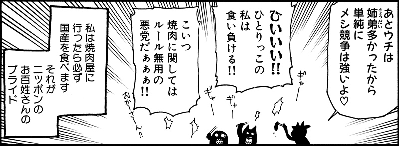 ———1巻に荒川先生が杜康先生たちと焼き肉に行くエピソードがありましたけど、その話では「私は焼き肉屋に行ったら必ず国産を食べます。それがニッポンのお百姓さんのプライド」というナレーションで締めていましたね。