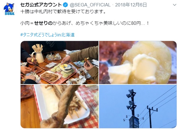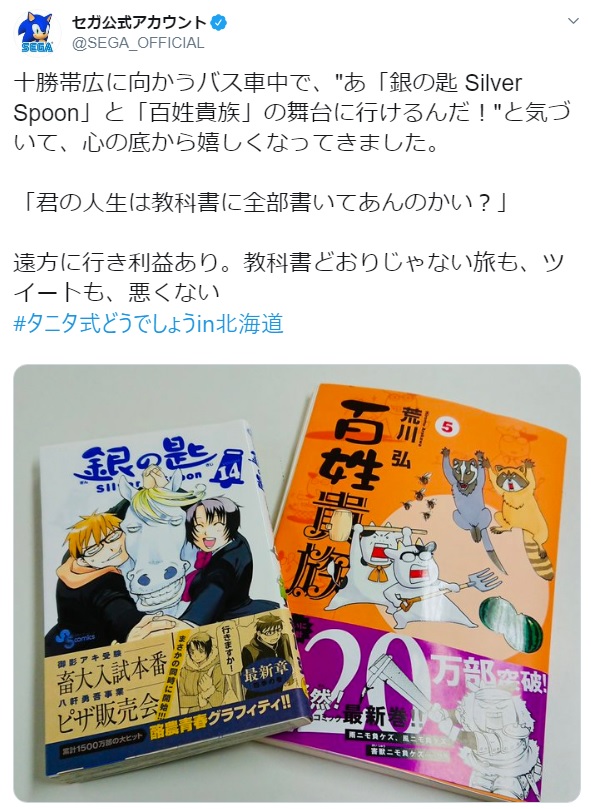 企業の公式アカウントですから、基本的には自社の情報を伝えます。セガ公式アカウントの場合は、8割宣伝で2割雑談でしょうか。自社と他社の知的財産権には特に気をつけていて、リスペクトと、適切な距離感を保つよういつも意識しています。一方で、情報を淡々と伝えるだけならば「bot(機械による自動発言システム)」でいいですよね。お客さまとしてはどんな人がツイートしているのかを知って安心したいという気持ちがあるので、自分を出しすぎず、「人となり」がほのかに伝わるような情報をあえて入れています。セガ社員である私がTwitterを毎日発信する意味は2つあって、1つは情報を即時正確に伝えること、もう1つは、ふとした社内の様子や社風、社員との会話やお客さまとの交流など、血が通った投稿。この2つに価値があると考えています。私は朝の挨拶で自分らしさを出すことが多いですね。「百姓貴族」のことを呟いたのは、北海道庁から復興支援を目的にお声がけいただき、タニタ・シャープ・キングジム・セガの「中の人」で北海道をツイートしながら旅した「タニタ式どうでしょう」企画でのことでした。(http://info.tanita-thl.co.jp/event/tanido/index.html)。行きあたりばったりで「水曜どうでしょう」的な展開のため、行き先も知らされないまま旭川にいたのですが、ナビゲーターから次は十勝だよとバスに乗せられた時、「百姓貴族」と「銀の匙 Silver Spoon」の舞台である場所についに行けると思ったらめちゃめちゃ嬉しくなって。ちょうど画像フォルダにその2冊を並べた画像があったので思わず呟いちゃいました(笑)。大好きなので!